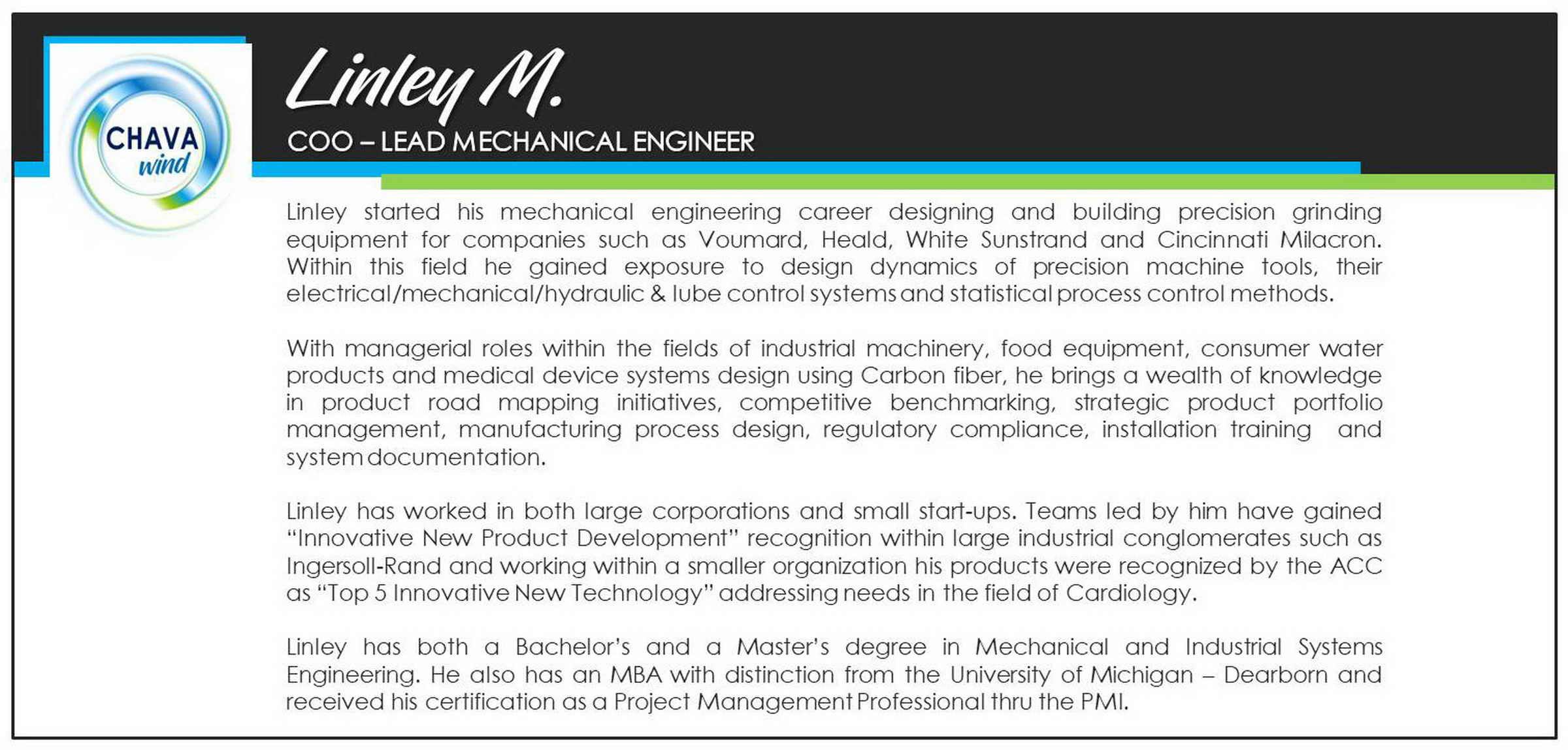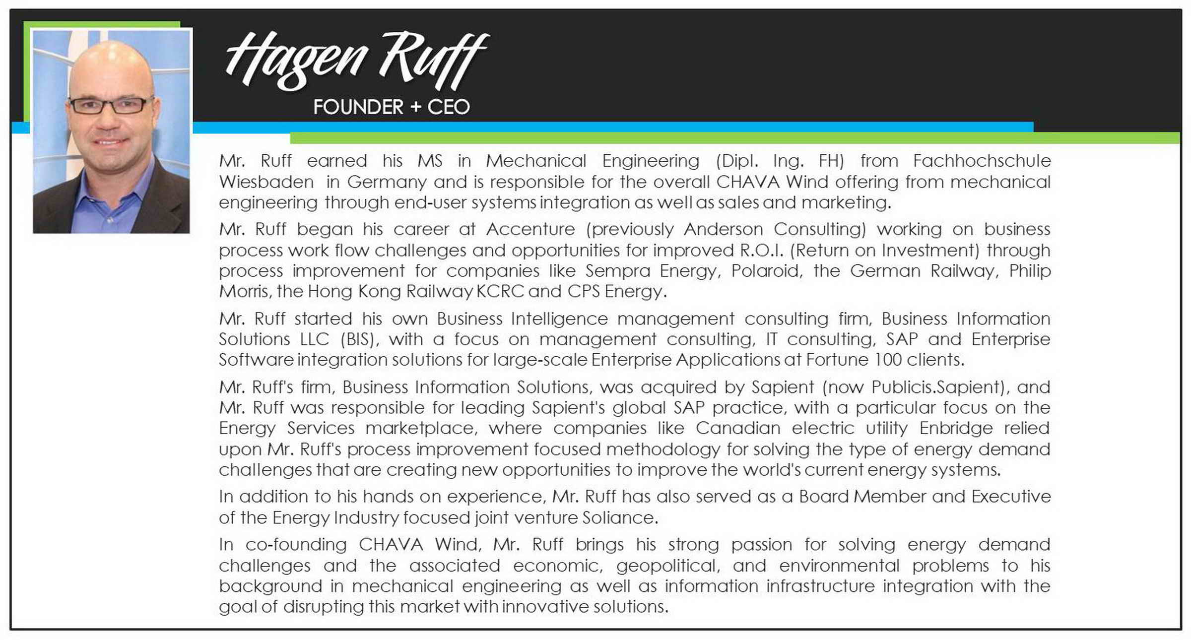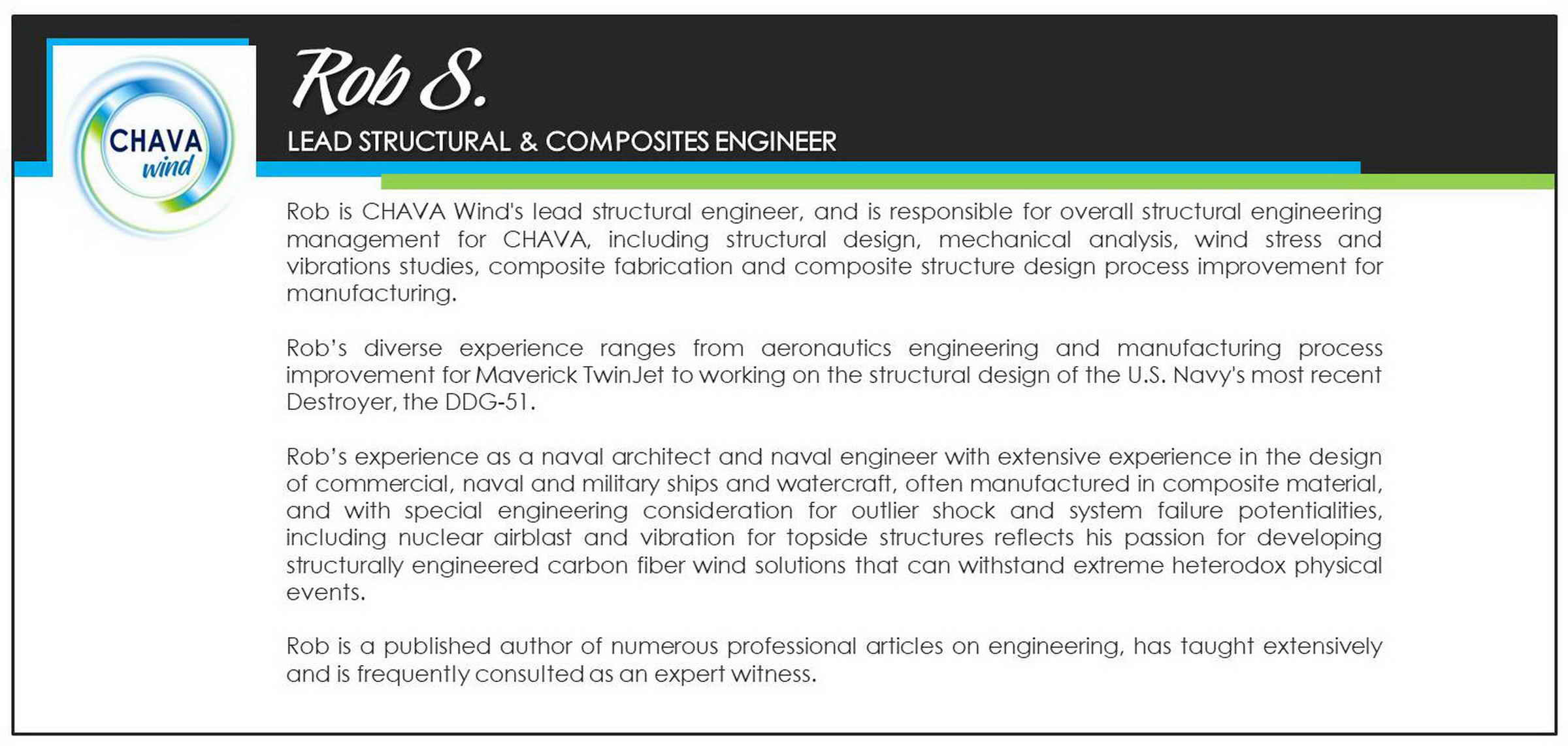 CHAVA approached the challenge of designing and manufacturing a leading edge, next generation small wind turbine by putting together a world class team of scientists, engineers, manufacturing experts, and process improvement specialists – spanning several continents – and all with a single focus on revolutionizing the economics and aesthetics of wind power.