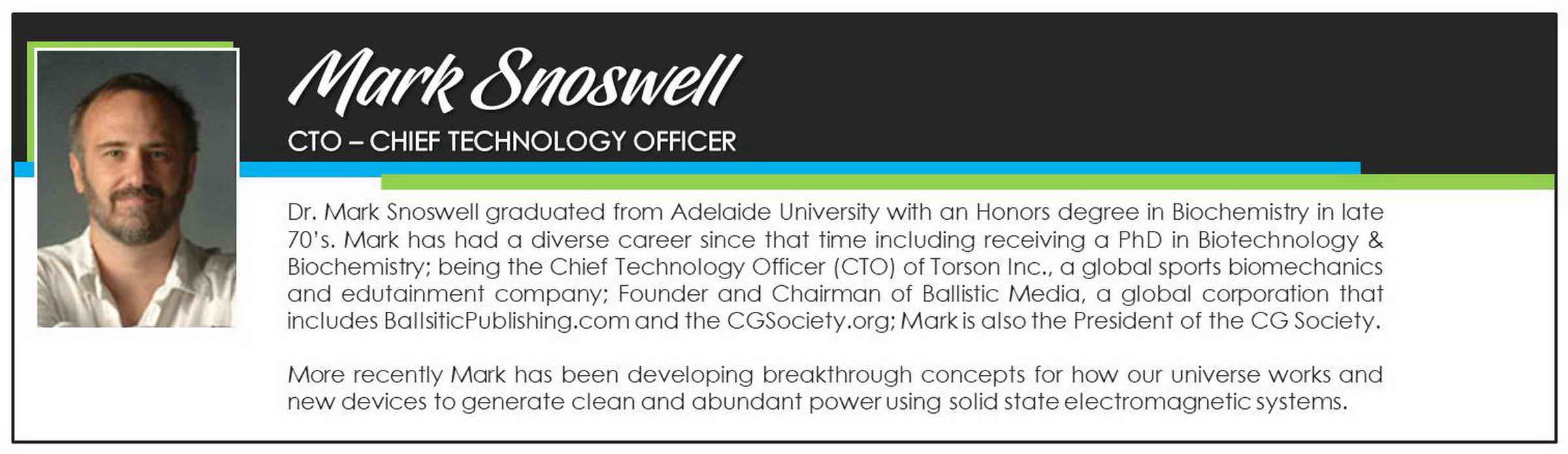 Our scientific research is headed by Dr. Mark Snoswell, our CTO a PhD in biotechnology whose diverse background has helped to position CHAVA as uniquely able to deliver on the potential for abundant power using solid state electromagnetic systems.